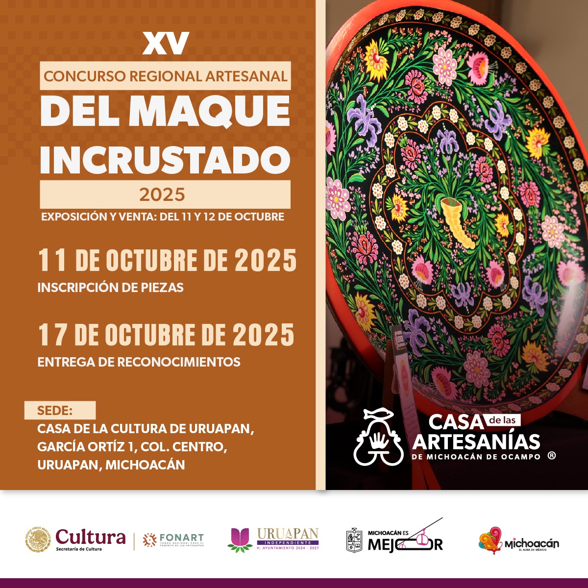 Secretaría de Cultura, a través del Fondo Nacional para el Fomento de las Artesanías, Fonart, y el Gobierno del Estado de Michoacán de Ocampo, mediante Casa de las Artesanías de Michoacán (CASART) en coordinación con el H. Ayuntamiento de Uruapan, con fundamento en el artículo 6, 11, 19 y 30 fracción VIll de la Ley de Fomento y Desarrollo Artesanal del Estado de Michoacán de Ocampo, convocan.